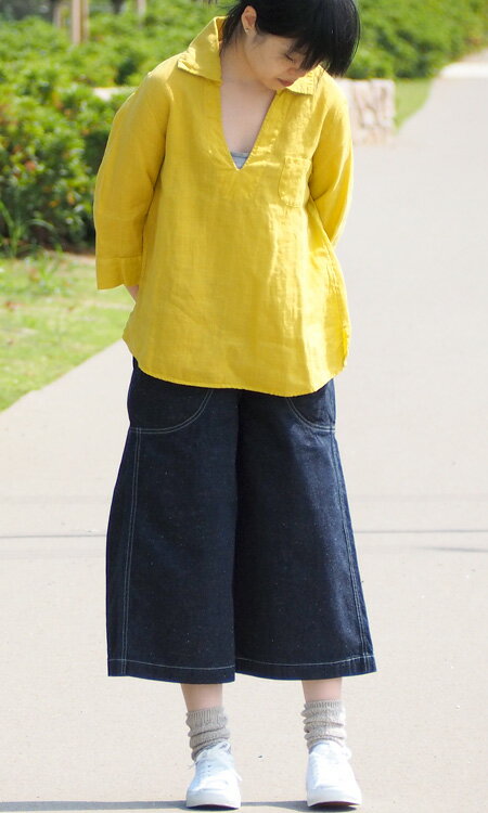 モデルの身長は156cm・7〜9号体型、Sサイズを着用 トップスはrolca on the notes アイリッシュリネン スプーンネックプルオーバーを着用しています ≪画像をクリックすると拡大されます≫ 季節を問わず穿いていただける、ほどよい厚みの生地です。